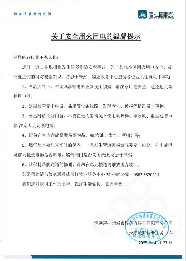您好!近日各地相继发生较多消防安全事故,为了加强小区用火用电安全,提高业主们的消防安全知识,防患于未然,物业服务中心提醒各位业主注意以下事项: