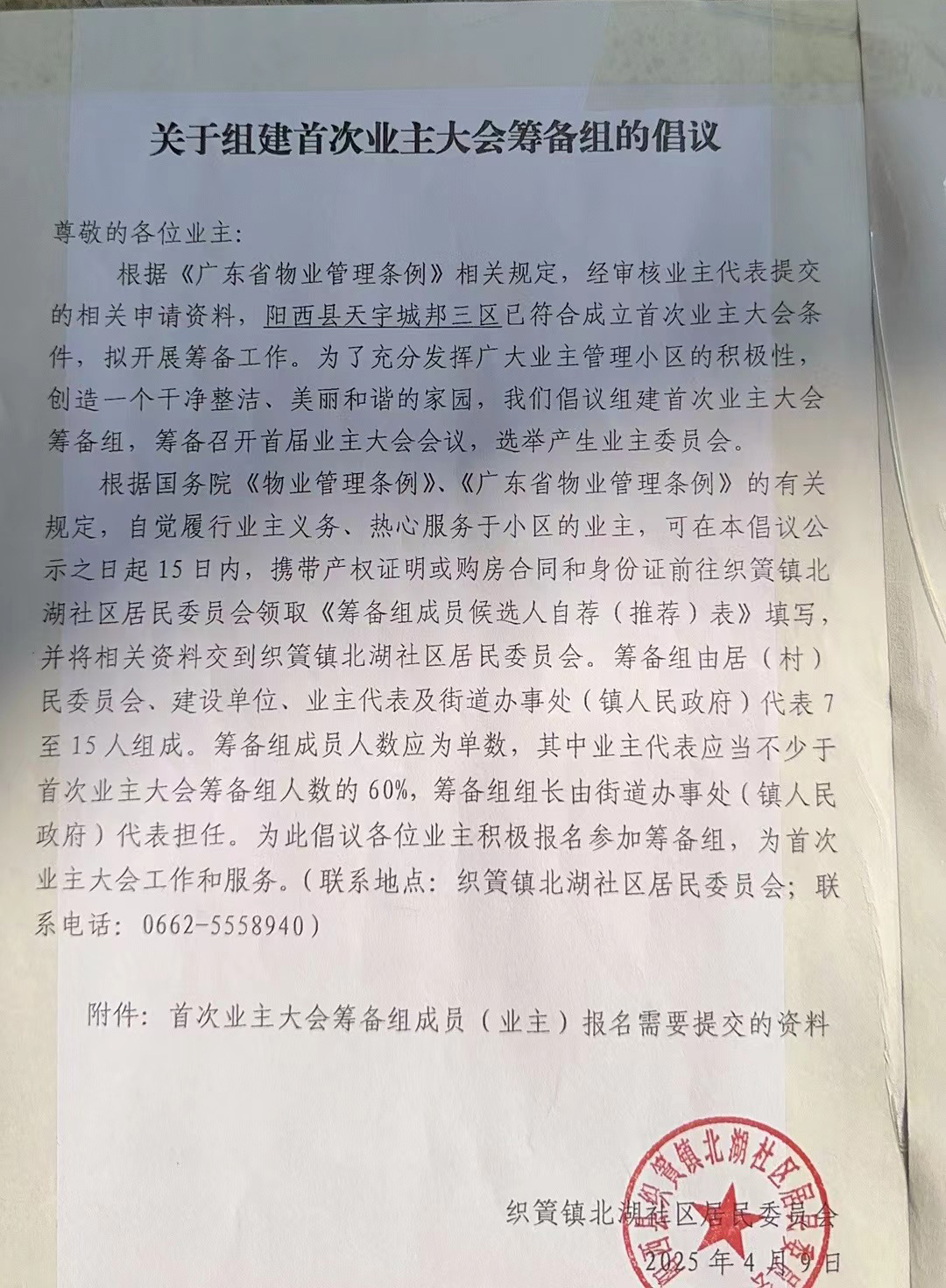 根据《广东省物业管理条例》相关规定,经审核业主代表提交的相关申请资料,阳西县天宇城邦三区已符合成立首次业主大会条件,拟开展筹备工作。为了充分发挥广大业主管理小区的积极性,创造一个干净整洁、美丽和谐的家园,我们倡议组建首次业主大会筹备组,筹备召开首届业主大会会议,选举产生业主委员会。