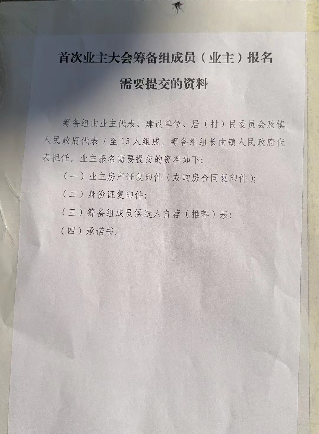筹备组由业主代表、建设单位、居(村)民委员会及镇人民政府代表7至15人组成。筹备组组长由镇人民政府代表担任。业主报名需要提交的资料如下: