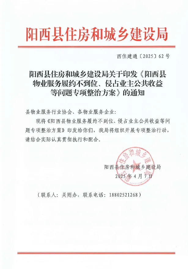 现将《阳西县物业服务履约不到位、侵占业主公共收益等问题专项整治方案》印发给你们,我局将组织开展专项整治行动,请结合实际认真贯彻执行和配合。