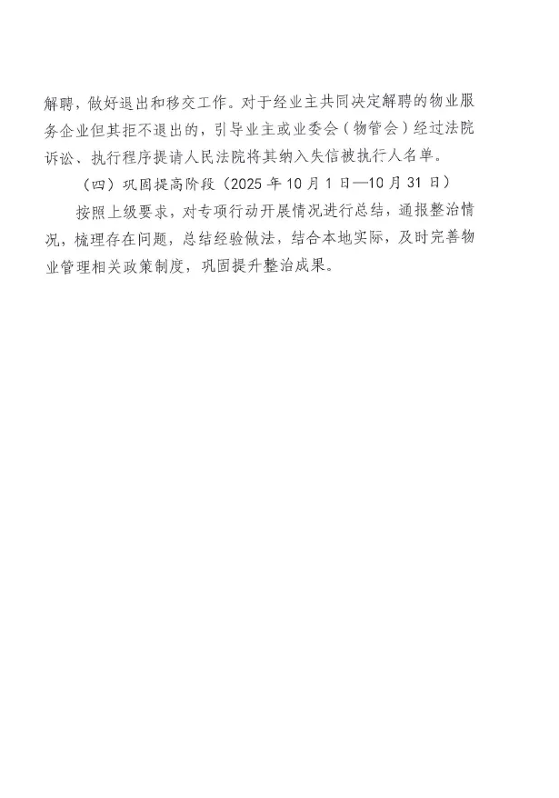 按照上级要求,对专项行动开展情况进行总结,通报整治情况,梳理存在问题,总结经验做法,结合本地实际,及时完善物业管理相关政策制度,巩固提升整治成果。